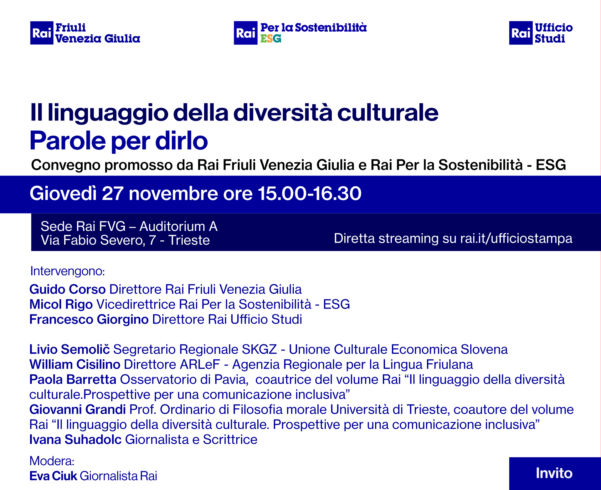 L’associazione Carta di Roma partecipa al convegno promosso dalla Sede Regionale Rai FVG e Direzione Rai Per la Sostenibilità-ESG “Il linguaggio della diversità culturale. Parole per dirlo” in programma giovedì 27 novembre 2025 – ore 15:00 – 16:30, nella Sede Regionale Rai FVG – Auditorium A, Via Fabio Severo, 7 – Trieste