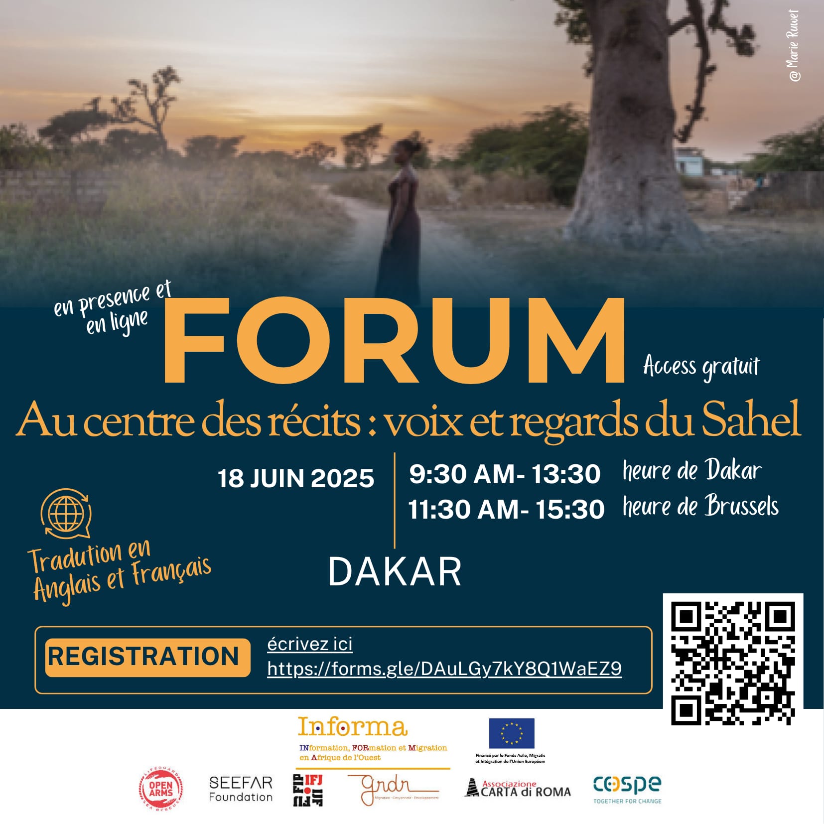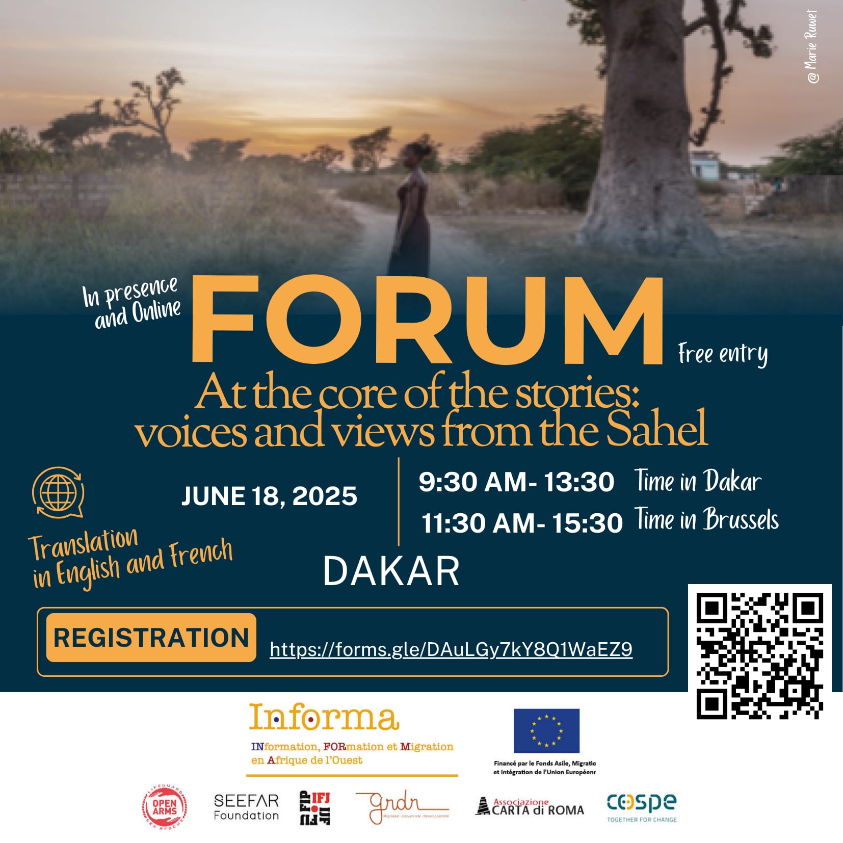 Il 18 giugno si terrà il forum “Au centre des récits : voix et regards du Sahel” (al centro delle storie: voci e sguardi del Sahel) nell’ambito del progetto INFORMA (INformation, FORmation et Migration en Afrique de l’Ouest) realizzato da Cospe con GRDR – Migration-Citoyenneté-Développement (Migrazione-Cittadinanza-Sviluppo), SEEFAR, Open Arms, IFJ – International Federation of Journalists (Federazione Internazionale dei Giornalisti), Associazione Carta di Roma, con il finanziamento dell’Unione Europea.