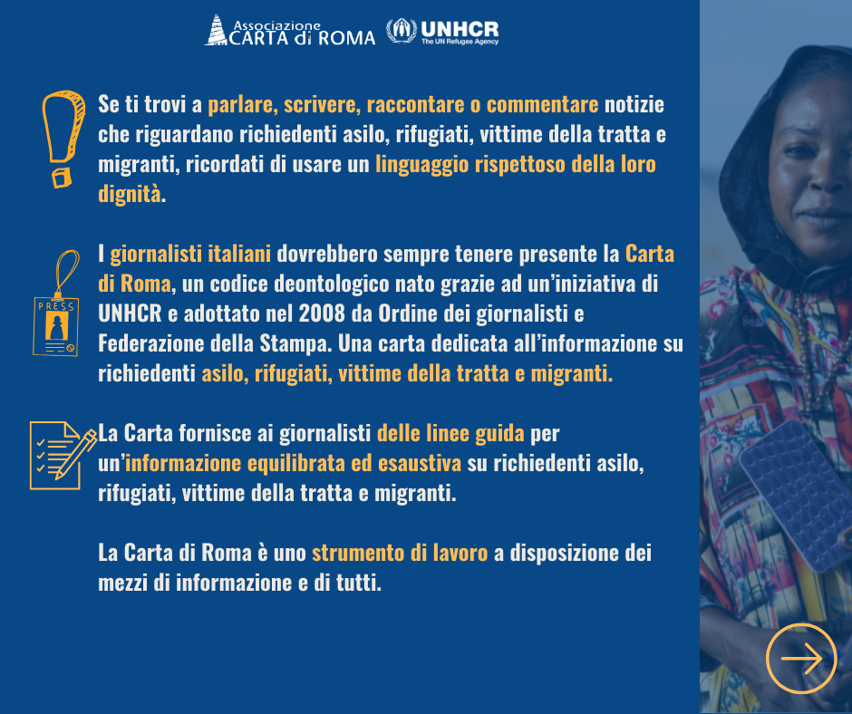 I giornalisti italiani dovrebbero sempre tenere presente la Carta di Roma, un codice deontologico nato grazie ad un’iniziativa di UNHCR e adottato nel 2008 da Ordine dei giornalisti e Federazione della Stampa. Una carta dedicata all’informazione su richiedenti asilo, rifugiati, vittime della tratta e migranti.