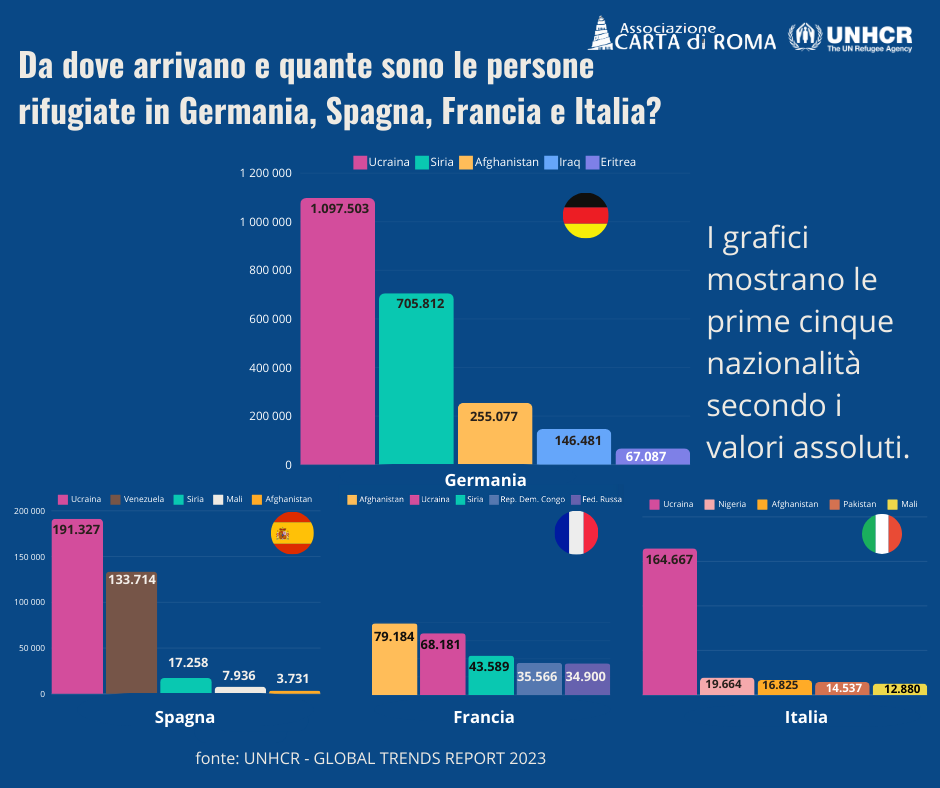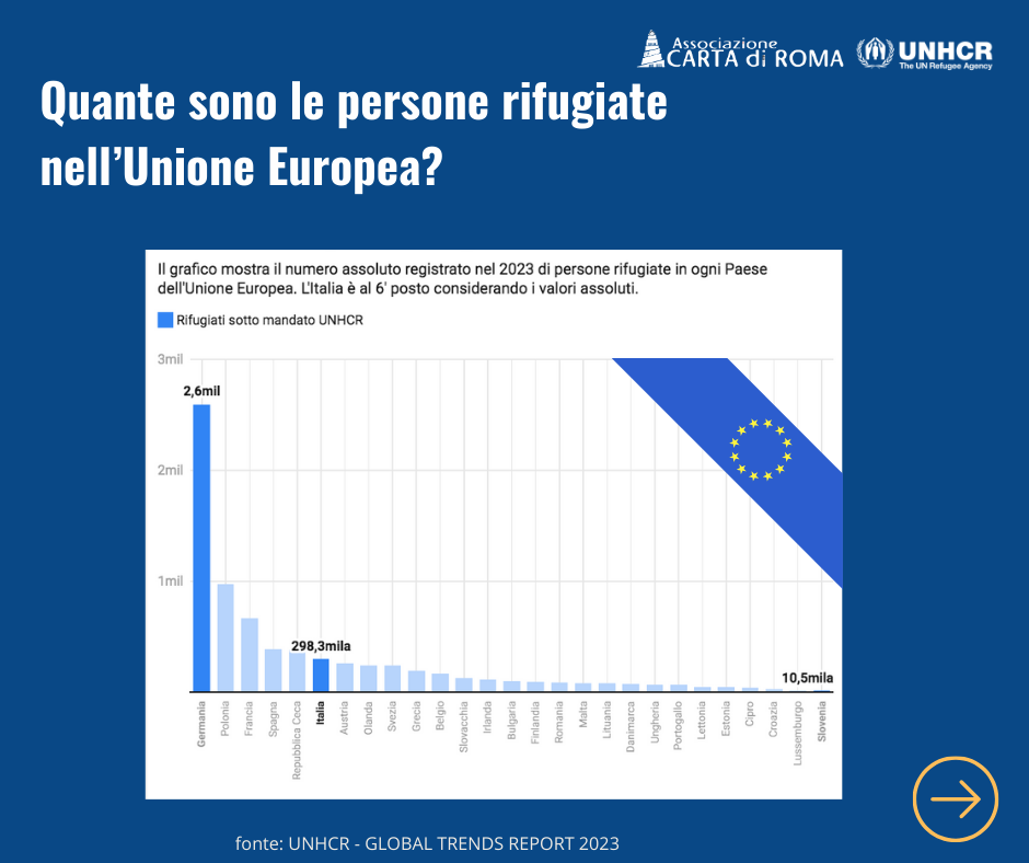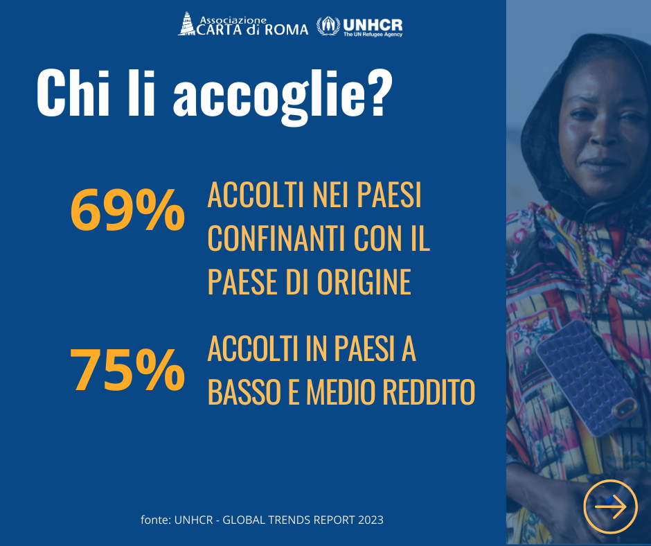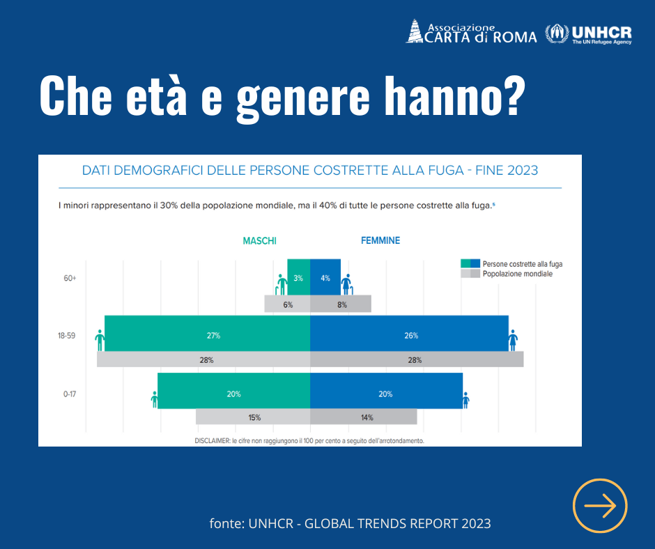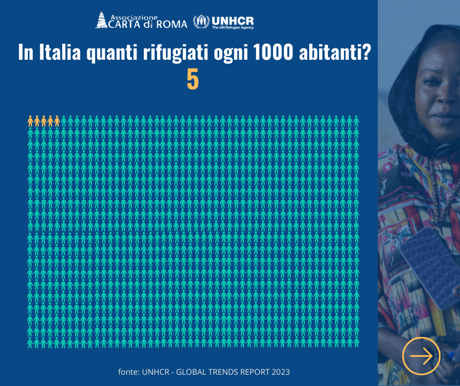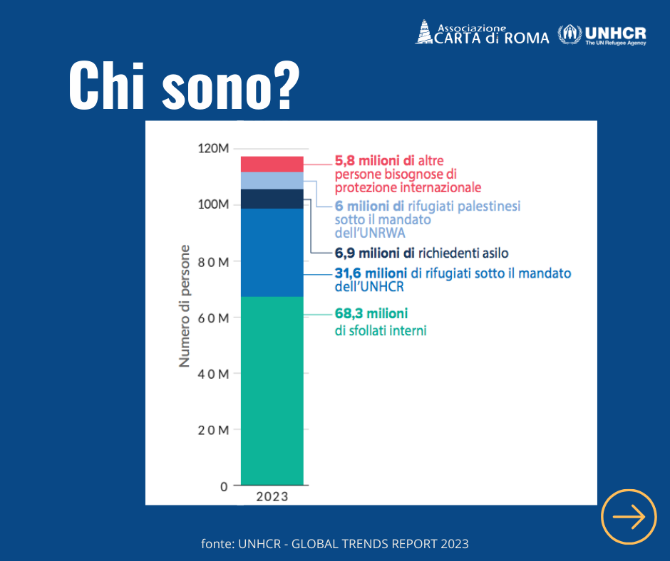 Oltre ogni impressione e percezione, facciamo parlare i dati contenuti nel “Global Trends Report 2023”, l’ultimo rapporto dell’Agenzia delle Nazioni Unite per i Rifugiati. Queste 10 card sono state realizzate dall’associazione Carta di Roma e UNHCR per parlare con cognizione di causa e numeri alla mano delle persone in fuga e rifugiate.