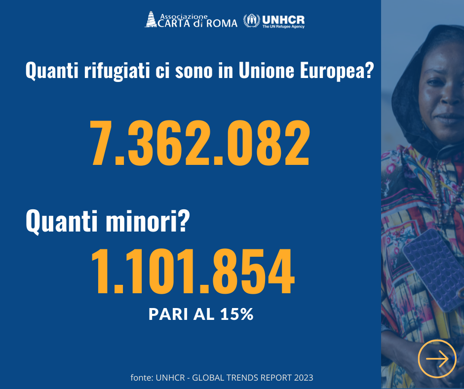 7.362.082 sono le persone rifugiate in Unione Europea; di queste 1.101.854, pari al 15%, sono minori.