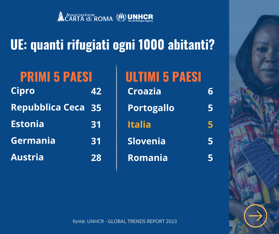 In Italia ci sono 5 persone rifugiate ogni 1000 abitanti. Comparando questo dato con il resto dei Paesi dell’UE, scopriamo che l’Italia è tra gli ultimi 5 Paesi in classifica, insieme alla Croazia, Slovenia, Portogallo e Romania.